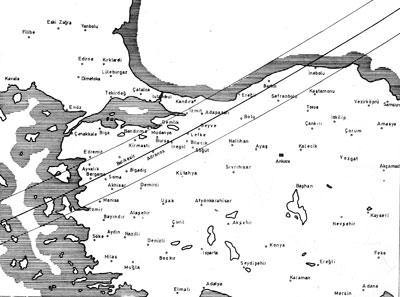 Tutulma sırasında yerin küresel yüzeyine düşen gölge elipsini ve bunun dışında kalan aydınlık dağları gördük. Bu elipsin büyük ekseninin yönü Karadeniz Ege denizi doğrultusunda ve tümü ile karanlıktı. En sonunda birkaç saniye süren ve güneybatıdan gelen zayıf bir ışıkta gözlendi.